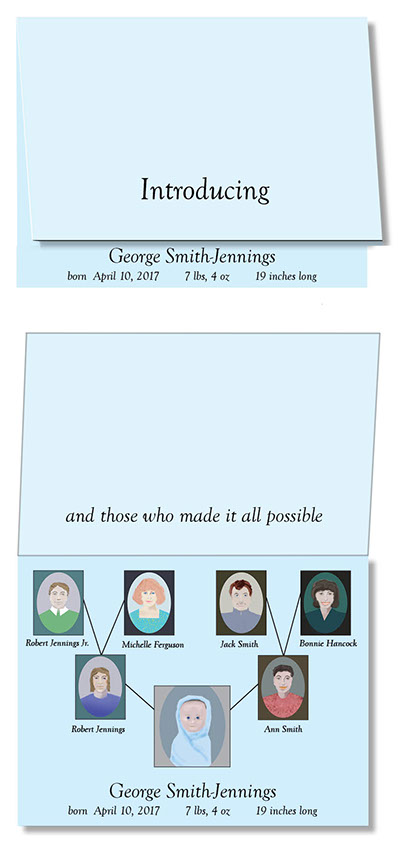 We offer a custom-designed birth announcement showing the latest arrival with a couple of past generations who helped out with this marvelous new creation.