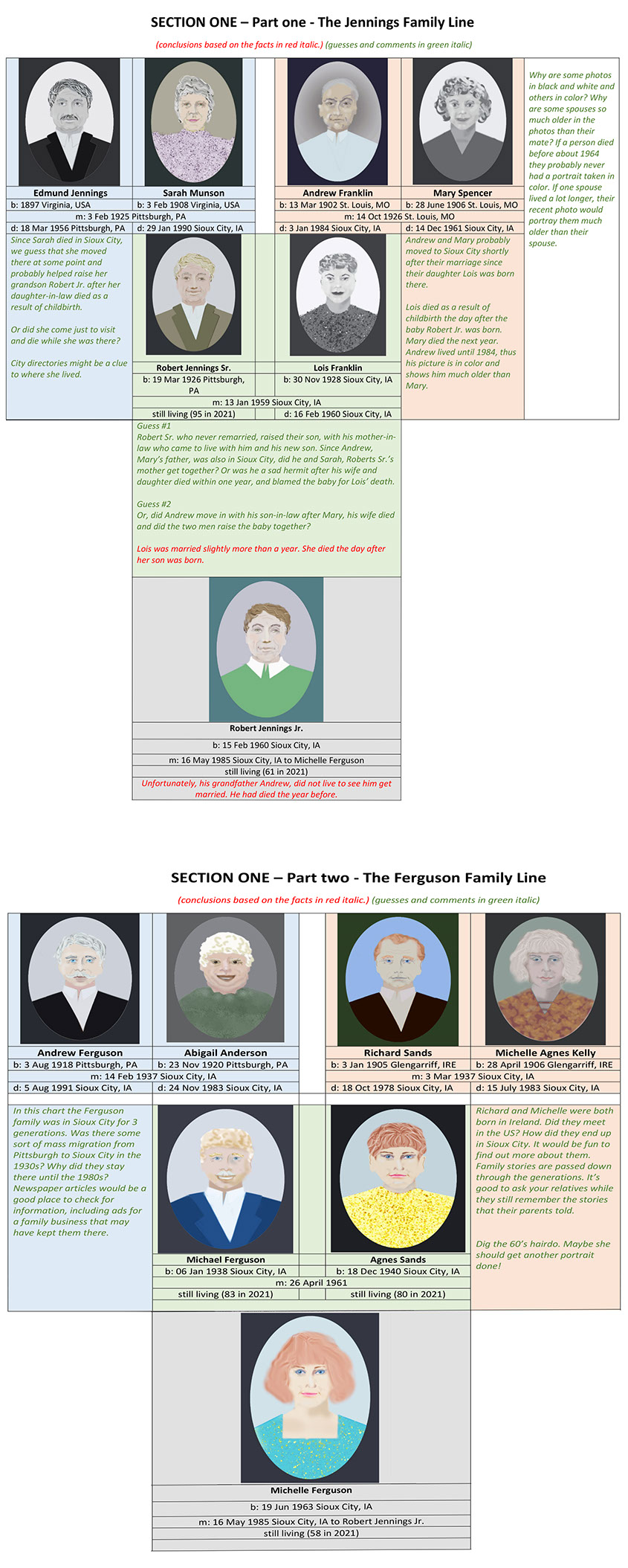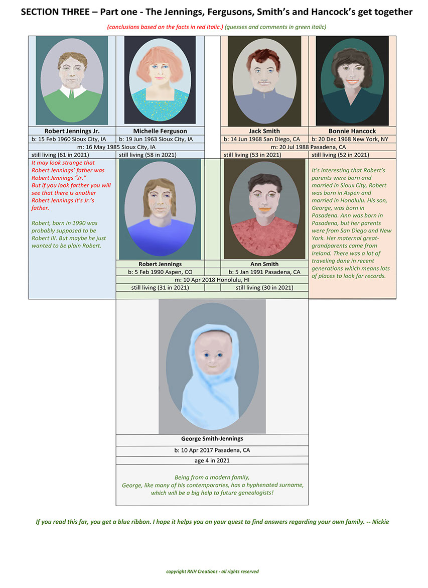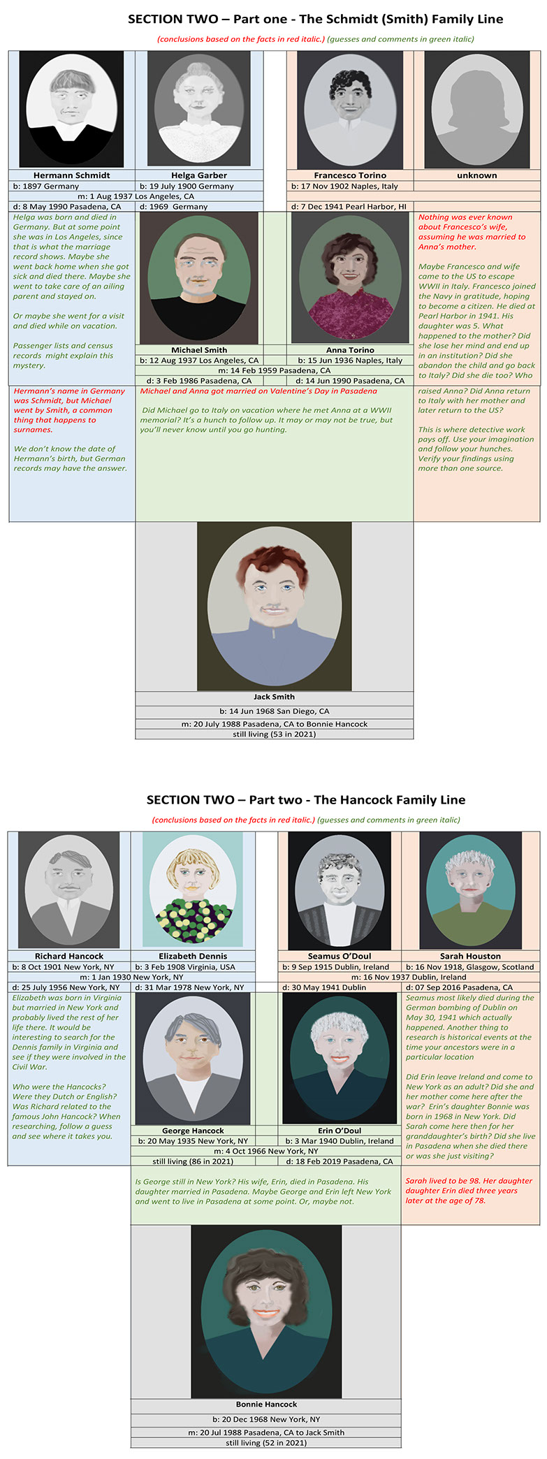 The following tree was created using an imaginary family. It was created for reference and to use as a guide when searching on your own, and analyzing the information you find.